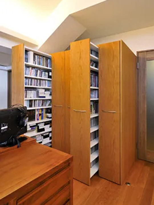 図書館の書庫のようなスライド式本棚を造作させていただきました。 使用しない時は家具のようにすっきり納まるので、空間を広く使えます。